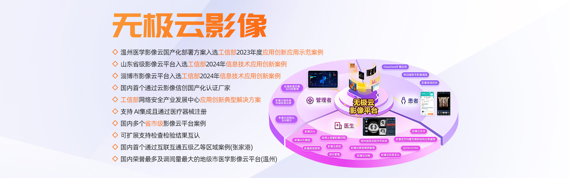 擁有多家年門診量400多萬以上人次的大型三甲醫院全院PACS及云影像案例,多個省市規模醫學影像云平臺案例,承建的溫州市醫學影像云平臺榮獲浙江省最多跑一次改革十佳案例、省領跑者定位題詞、全國惠民便民優秀案例、基于影像云AI分析試點單位等榮譽。